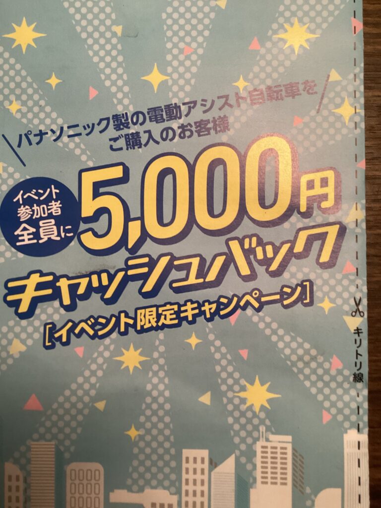 パナソニック電動アシスト自転車ご購入時に5000円のキャッシュバックの特典をプレゼント致します。